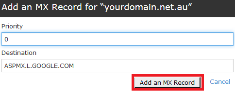Now enter your Priority, the Destination (sometimes named Record) and click Add an MX Record